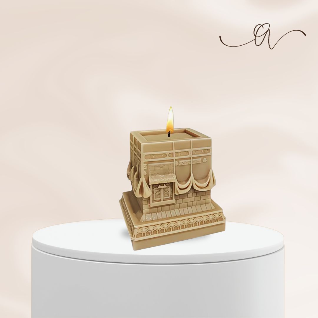 A Kaaba-inspired square candle in warm beige tones, showcasing detailed drapery, architectural texture, and elevation on a ceremonial base.