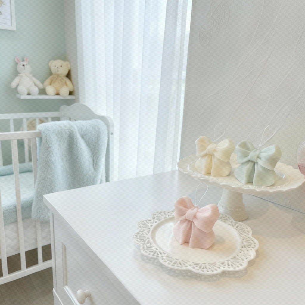 Grace · Celebration. A soft emblem of love and joy, this candle radiates the sweetness of new beginnings. The pink bow symbolizes heartfelt affection, elegance, and the tender beauty of welcoming life.